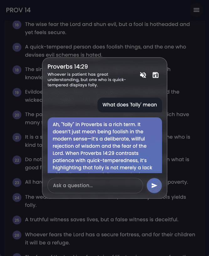 The app is both minimalist yet packed with features. Numerous APIs work alongside each other to stream video, engage readers with life-like TTS (Text-to-Speech), and offer in-depth analysis of the book of Proverbs.